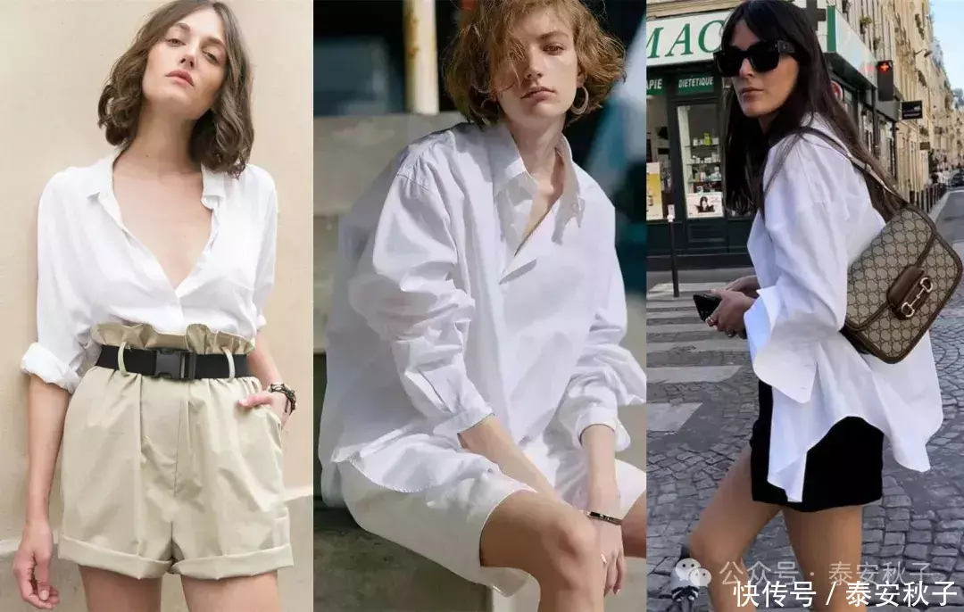 日常出街、或打卡咖啡馆的时候,可用Oversize的白衬衫,搭配黑色的西装短裤:让衬衫的衣摆随意散开,打破单调还显比例,有一种很酷、很飒的味道。